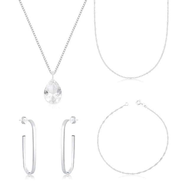 Composto por um colar de prata com pingente gota em zircônia e corrente de 45cm, acompanhado de uma elegante corrente Elo Singapura de 40cm para sobreposição. Para complementar, o mix traz uma pulseira Singapura de 18cm que harmoniza perfeitamente com o conjunto, e um moderno brinco de prata estilo argola aberta com design retangular de 5cm — leve, atual e marcante.