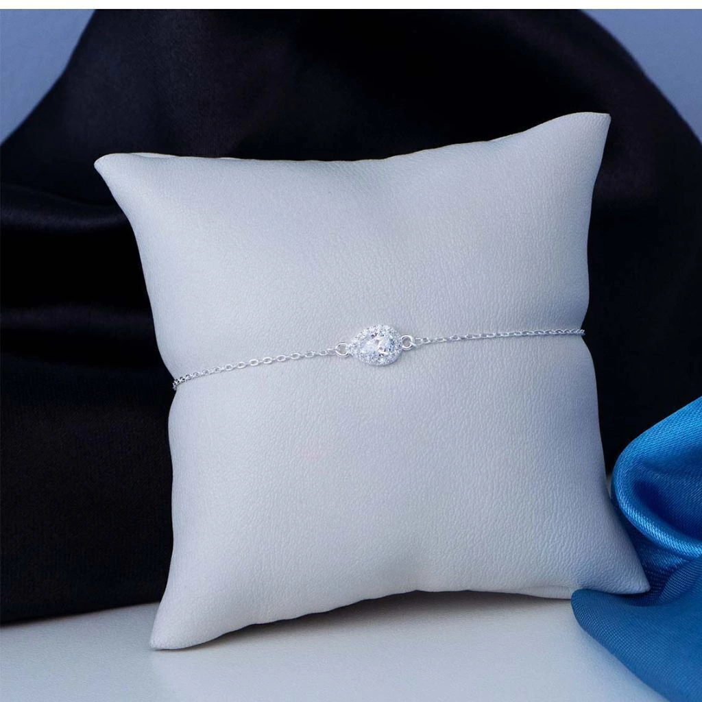 Delicada e cheia de brilho, esta pulseira de prata 925 traz um pingente em formato de gota de 6mm, cravejada com zircônias brancas. O detalhe da gota deitada proporciona um design moderno e elegante, perfeito para mulheres que valorizam joias sofisticadas e minimalistas.
