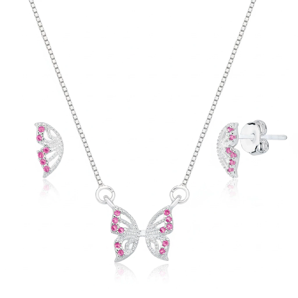O Conjunto de Prata 925 Borboleta Cravejada é a escolha perfeita para quem ama joias delicadas, femininas e cheias de brilho. Acompanha um colar com pingente em formato de borboleta e um par de brincos coordenados, todos cravejados com micro zircônias cintilantes.